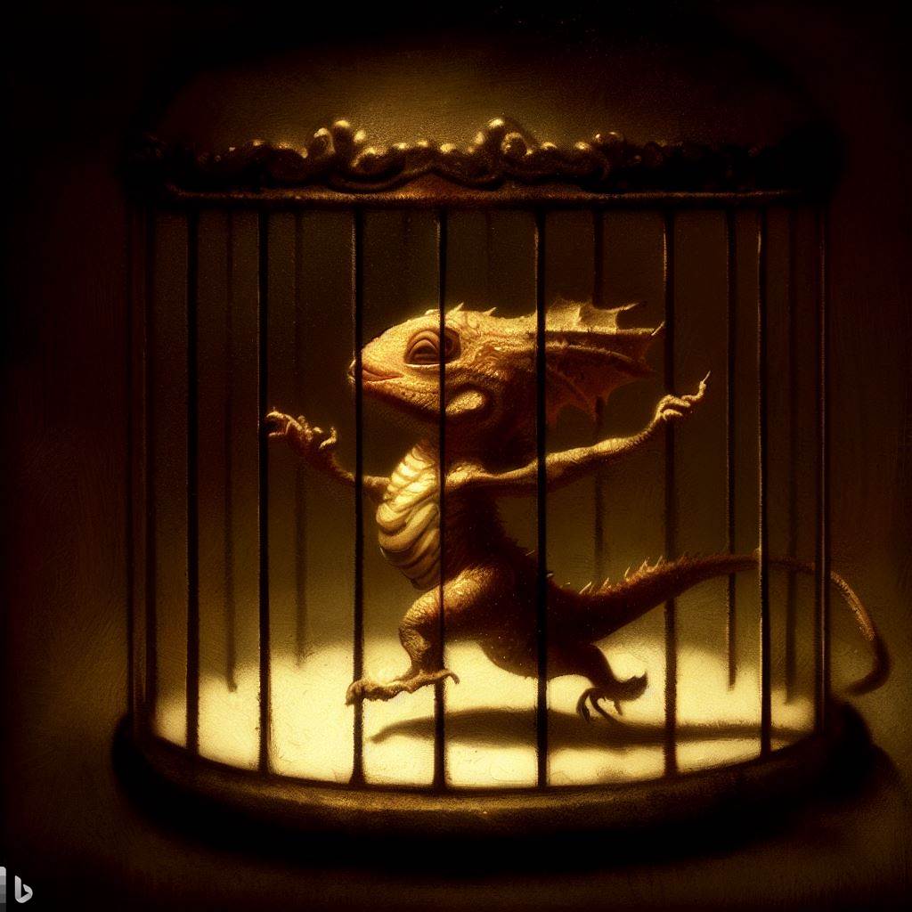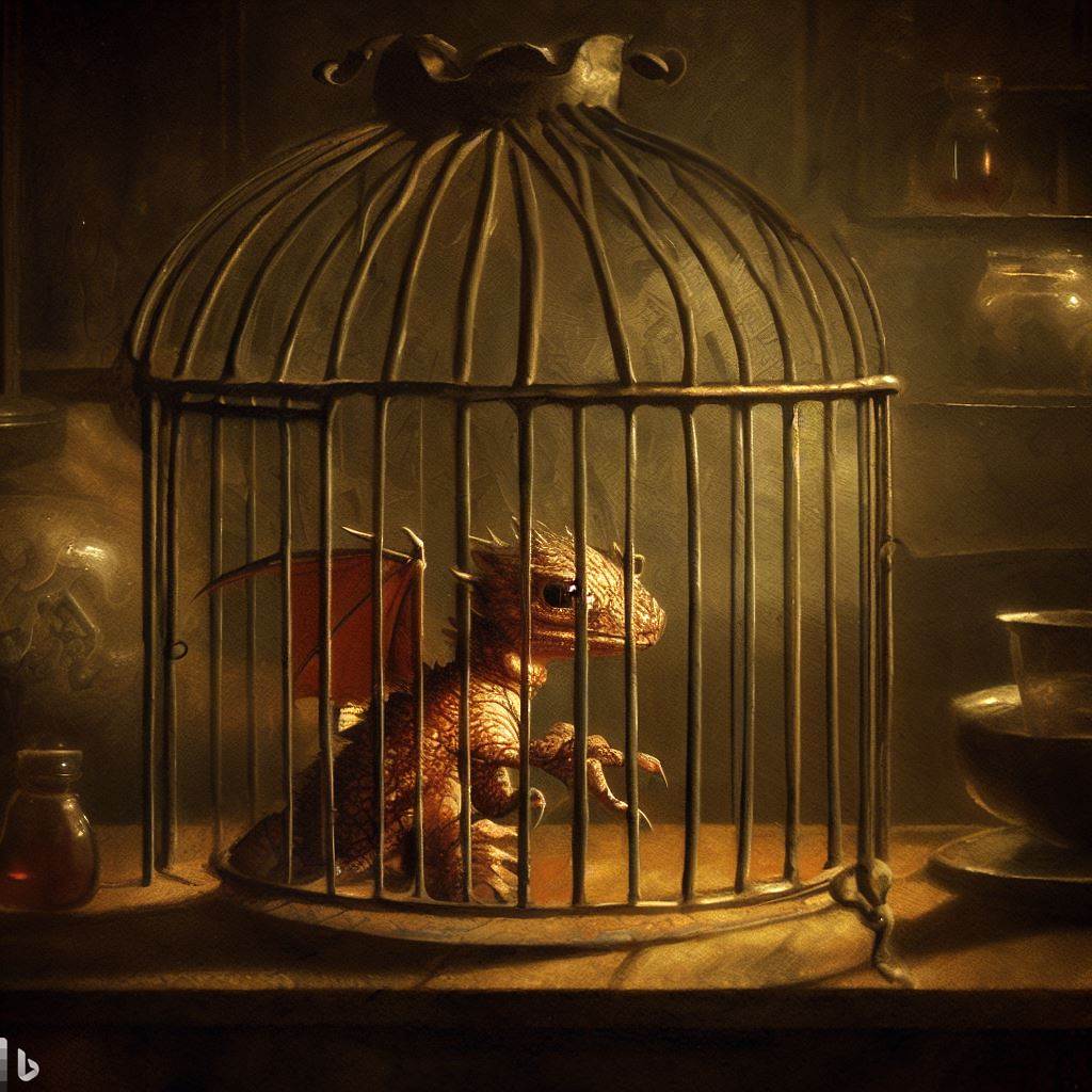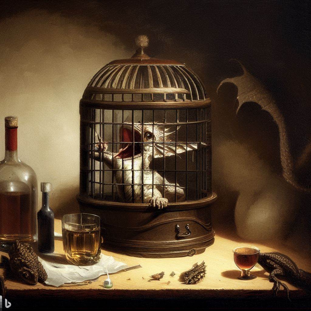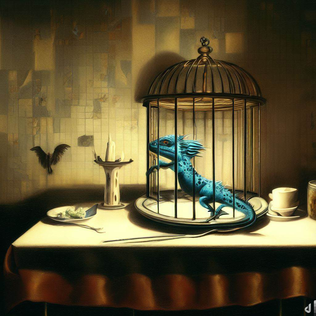 Pour cette série, j’ai fait imaginer au générateur d’images DALL.E : des peintures de mini-dragons enfermés dans une cage à oiseaux, en adoptant le style de Caravage.
