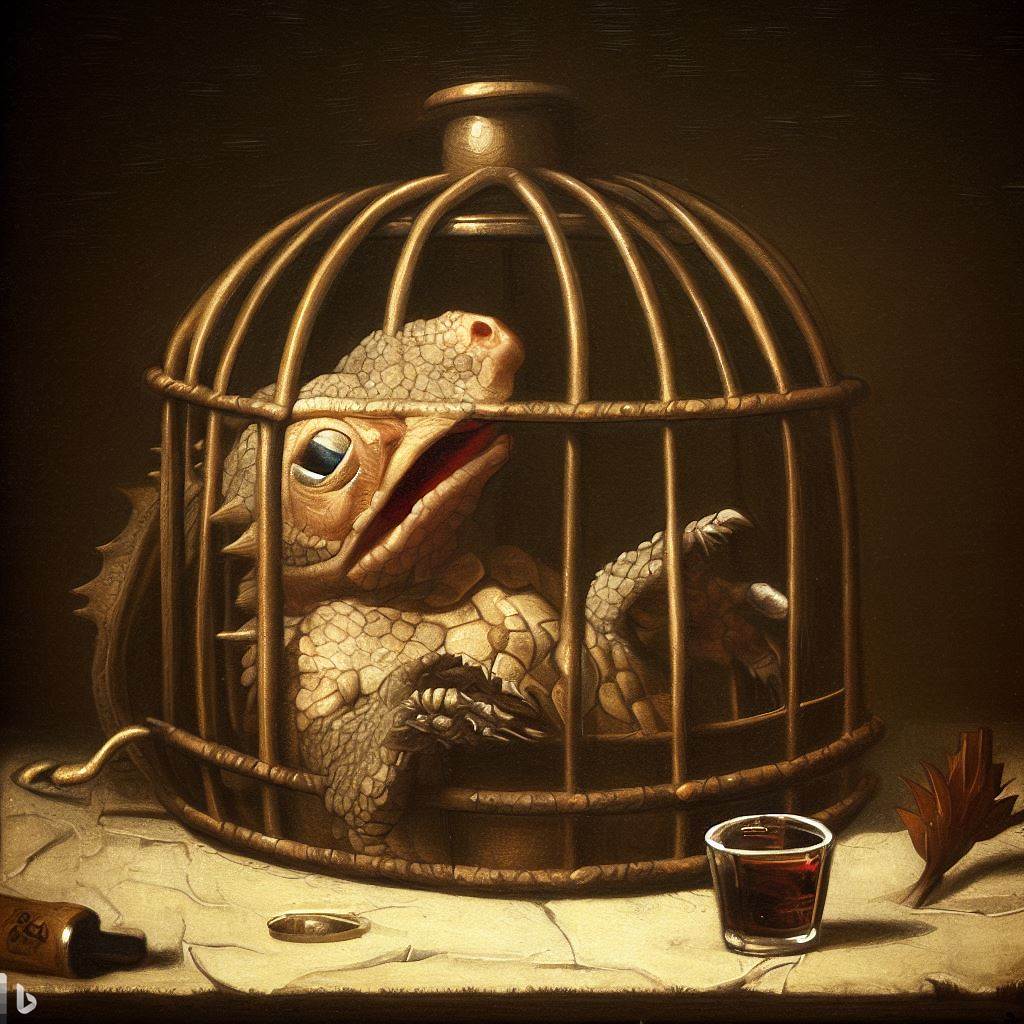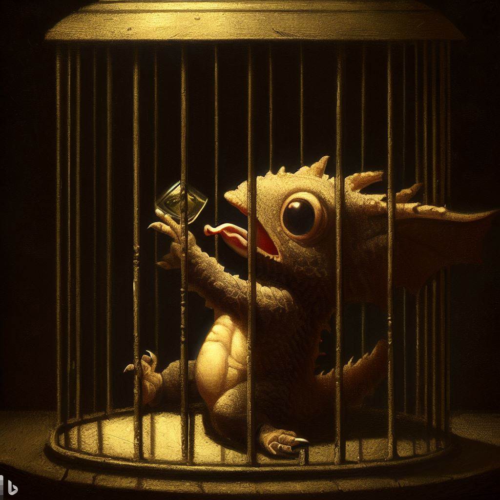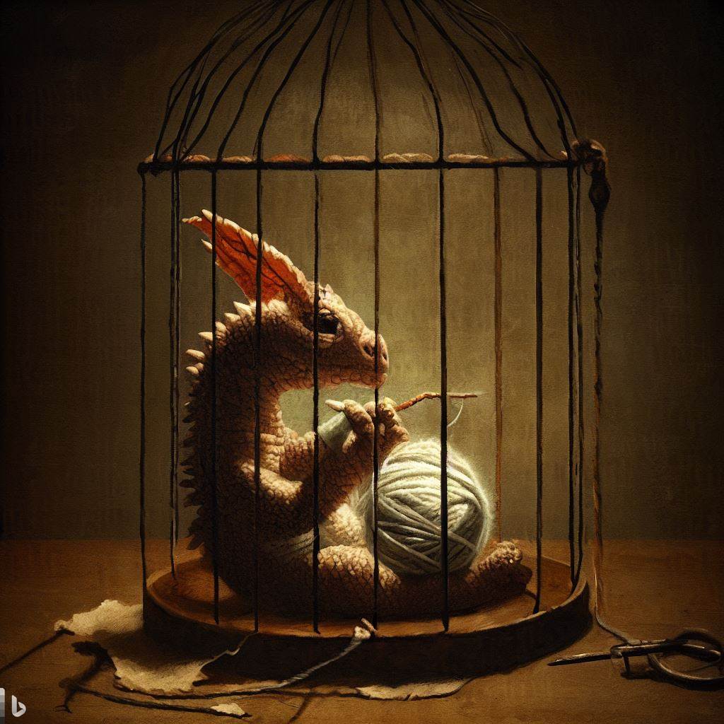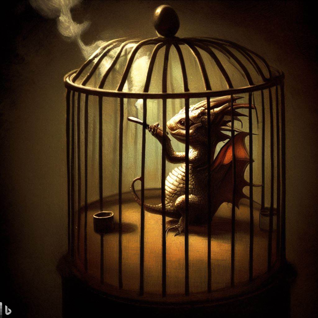 Pour cette série, j’ai fait imaginer au générateur d’images DALL.E : des peintures de mini-dragons enfermés dans une cage à oiseaux, en adoptant le style de Caravage.