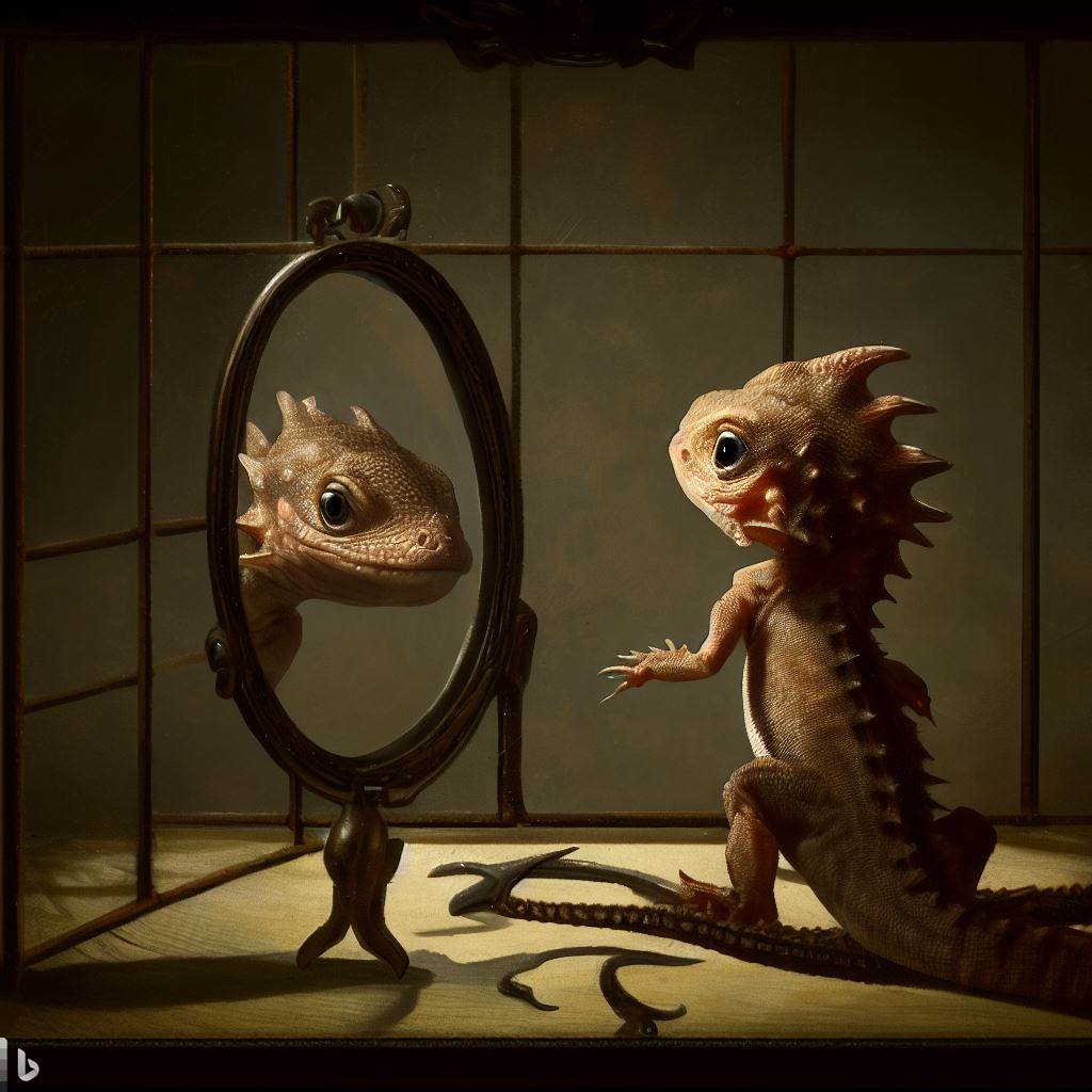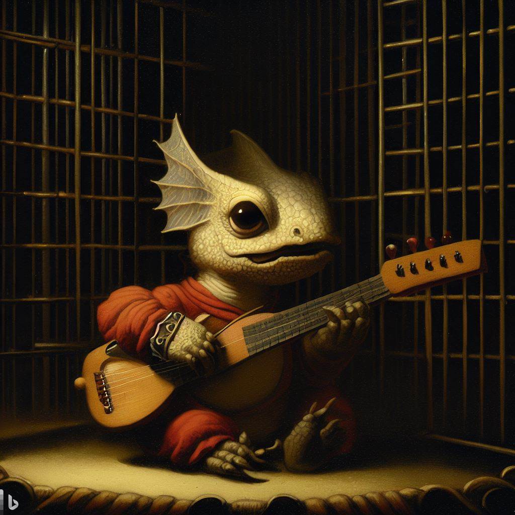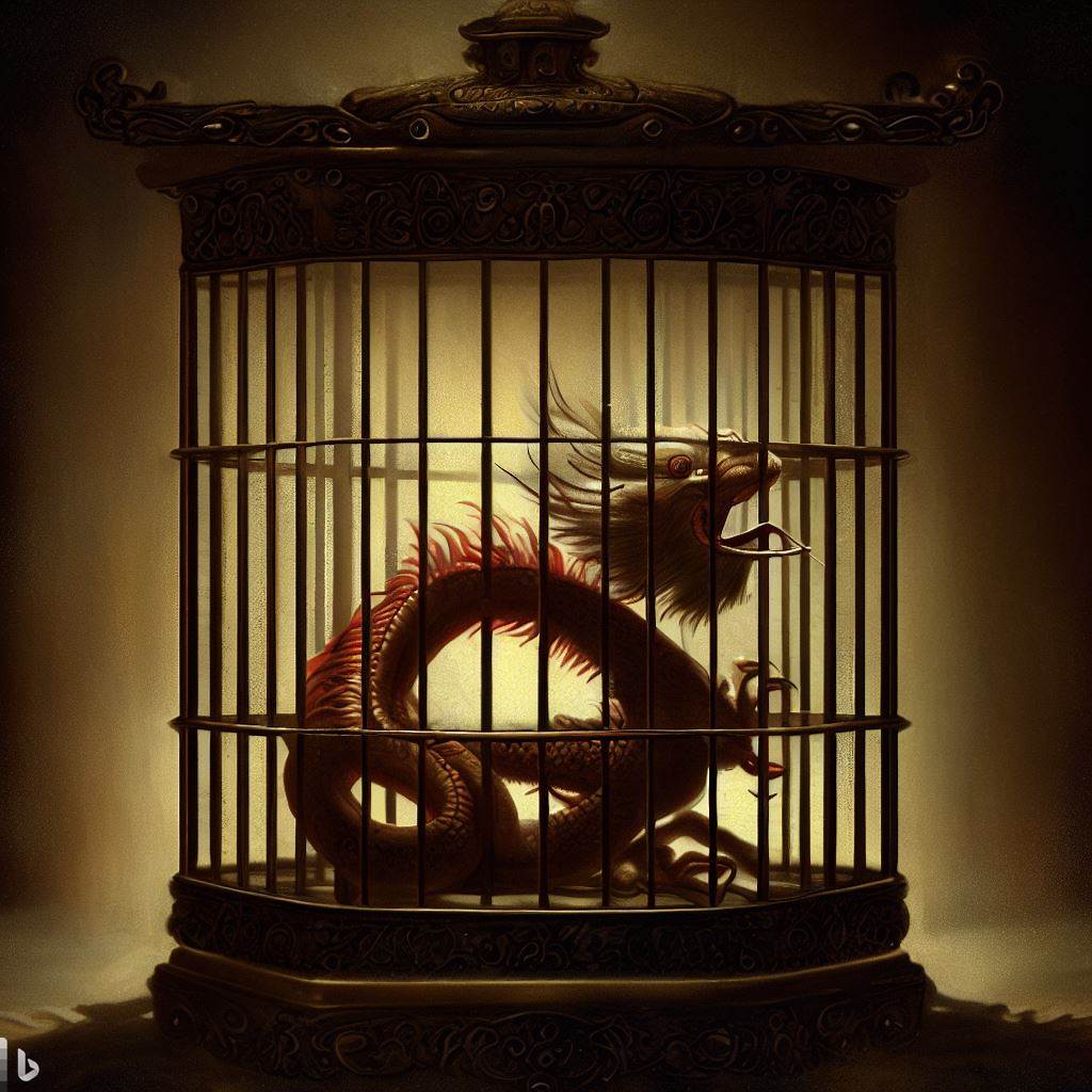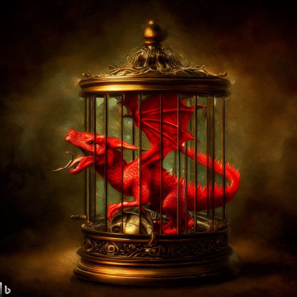Pour cette série, j’ai fait imaginer au générateur d’images DALL.E : des peintures de mini-dragons enfermés dans une cage à oiseaux, en adoptant le style de Caravage.