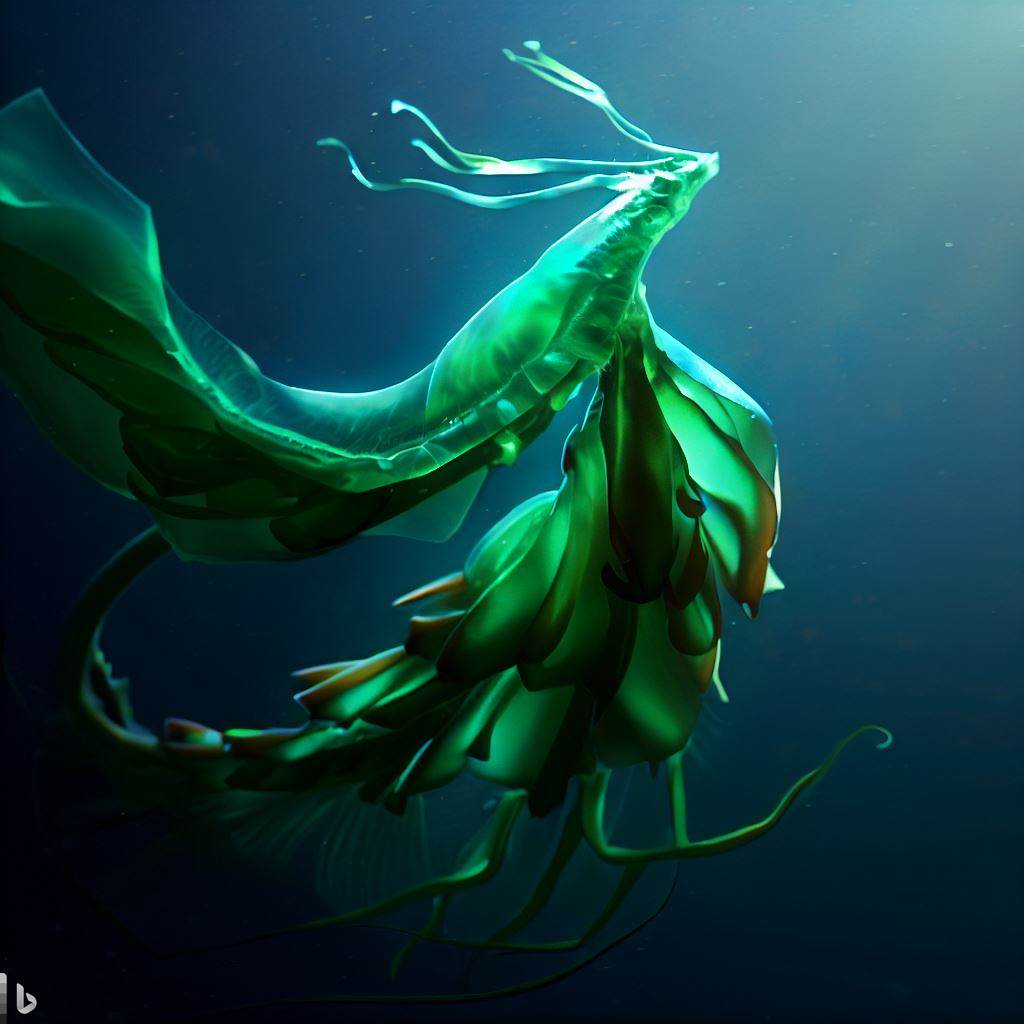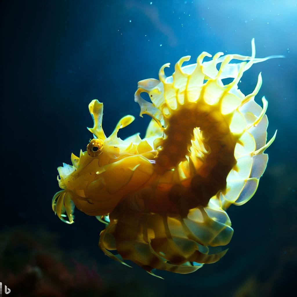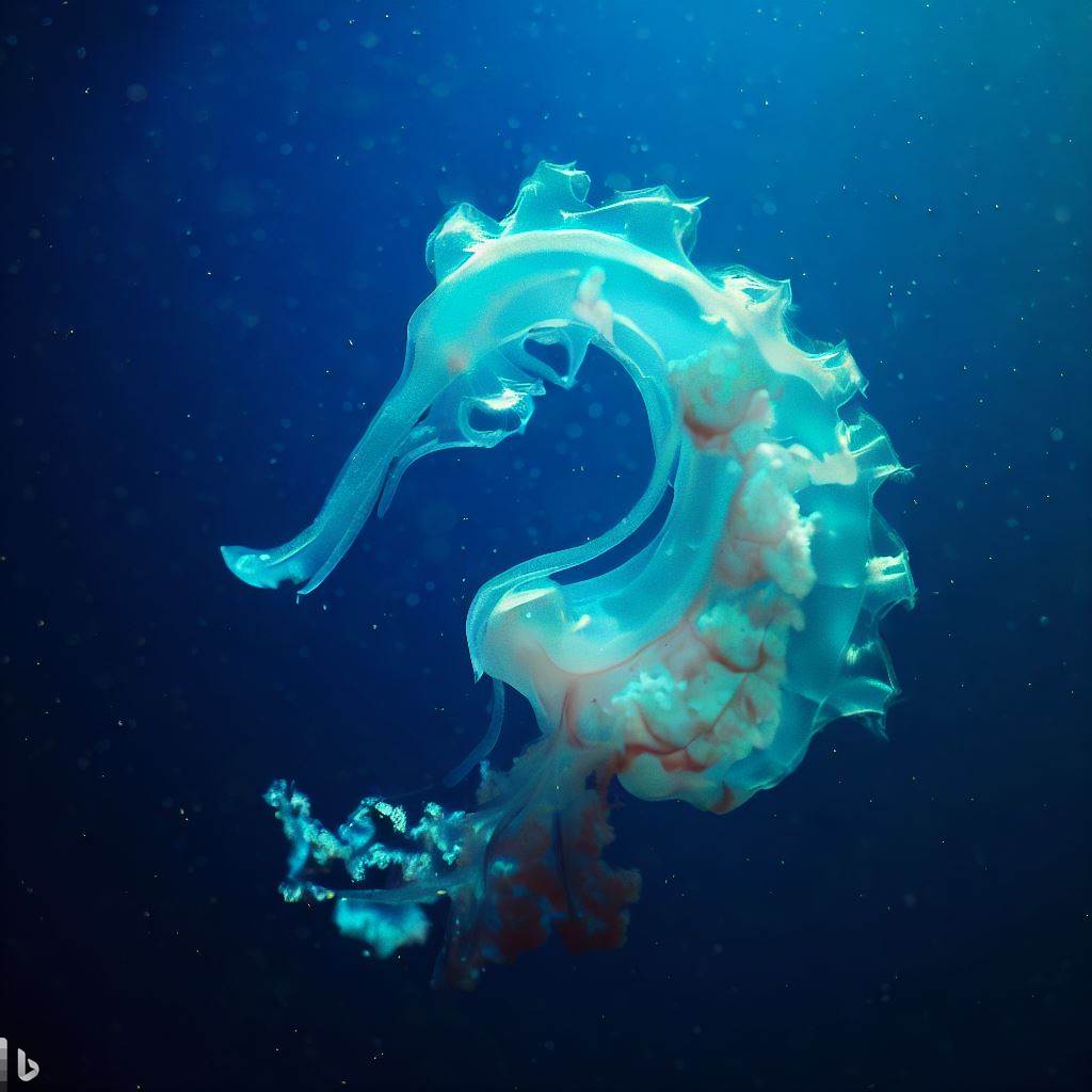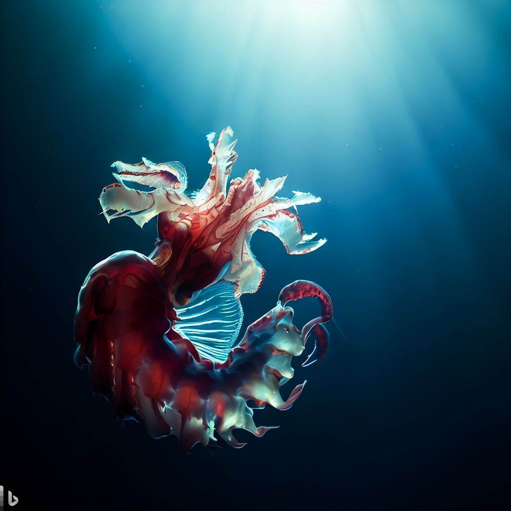 Pour cette série, j’ai fait imaginer au générateur d’images DALL.E : des créatures aquatiques inconnues hybridant des méduses avec d’autres espèces de poissons, de crustacés, de reptiles ou d’insectes évoluant dans les profondeurs des océans.