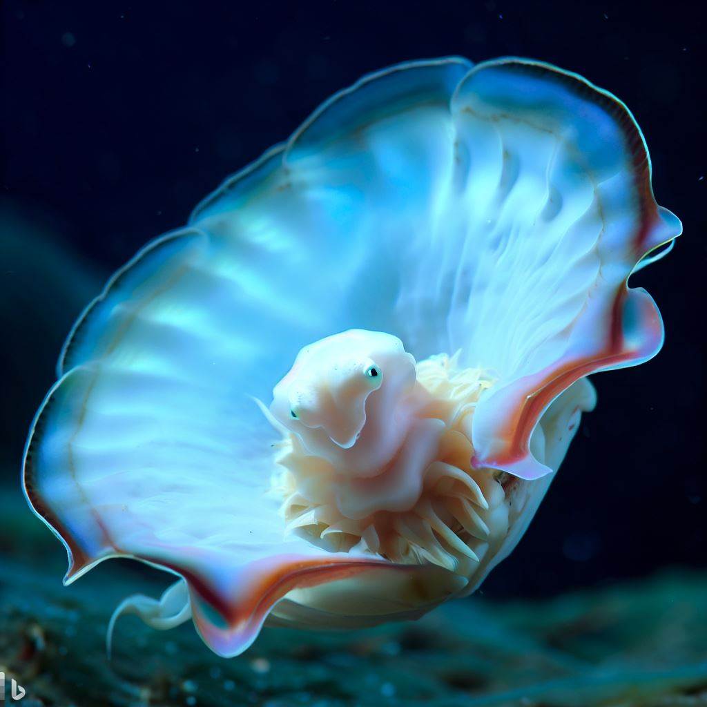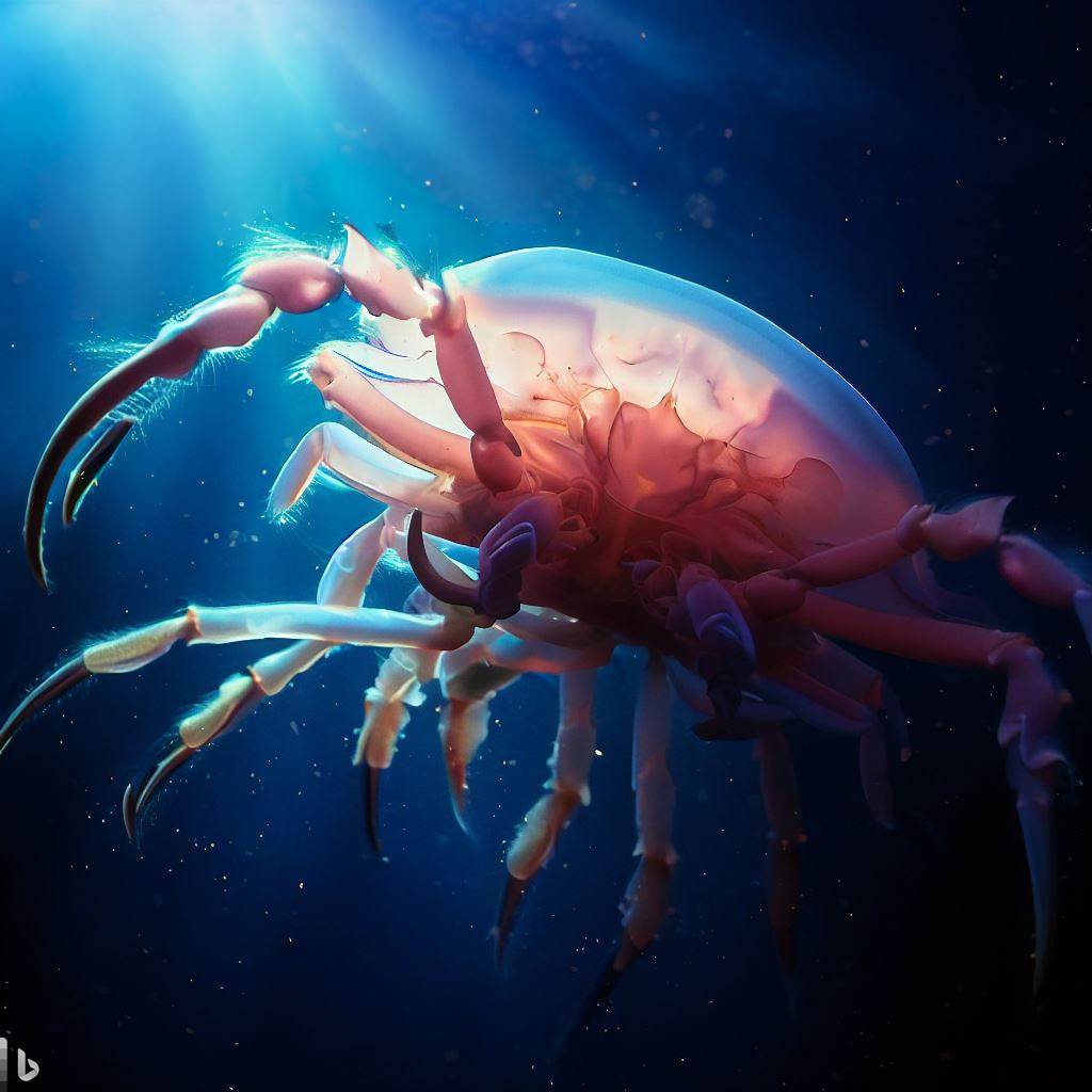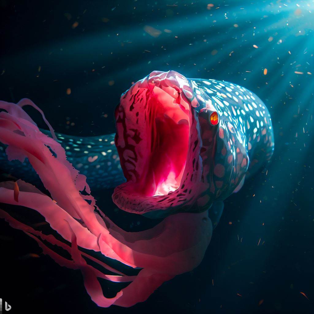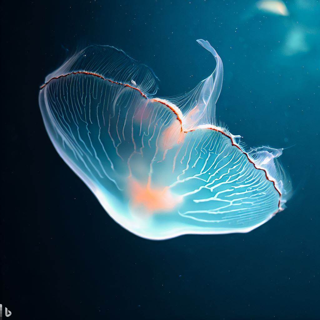 Pour cette série, j’ai fait imaginer au générateur d’images DALL.E : des créatures aquatiques inconnues hybridant des méduses avec d’autres espèces de poissons, de crustacés, de reptiles ou d’insectes évoluant dans les profondeurs des océans.
