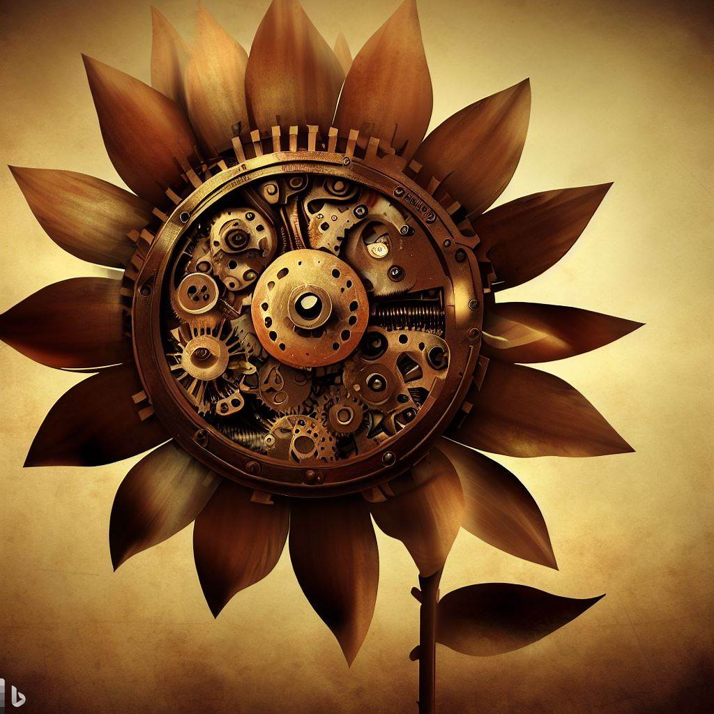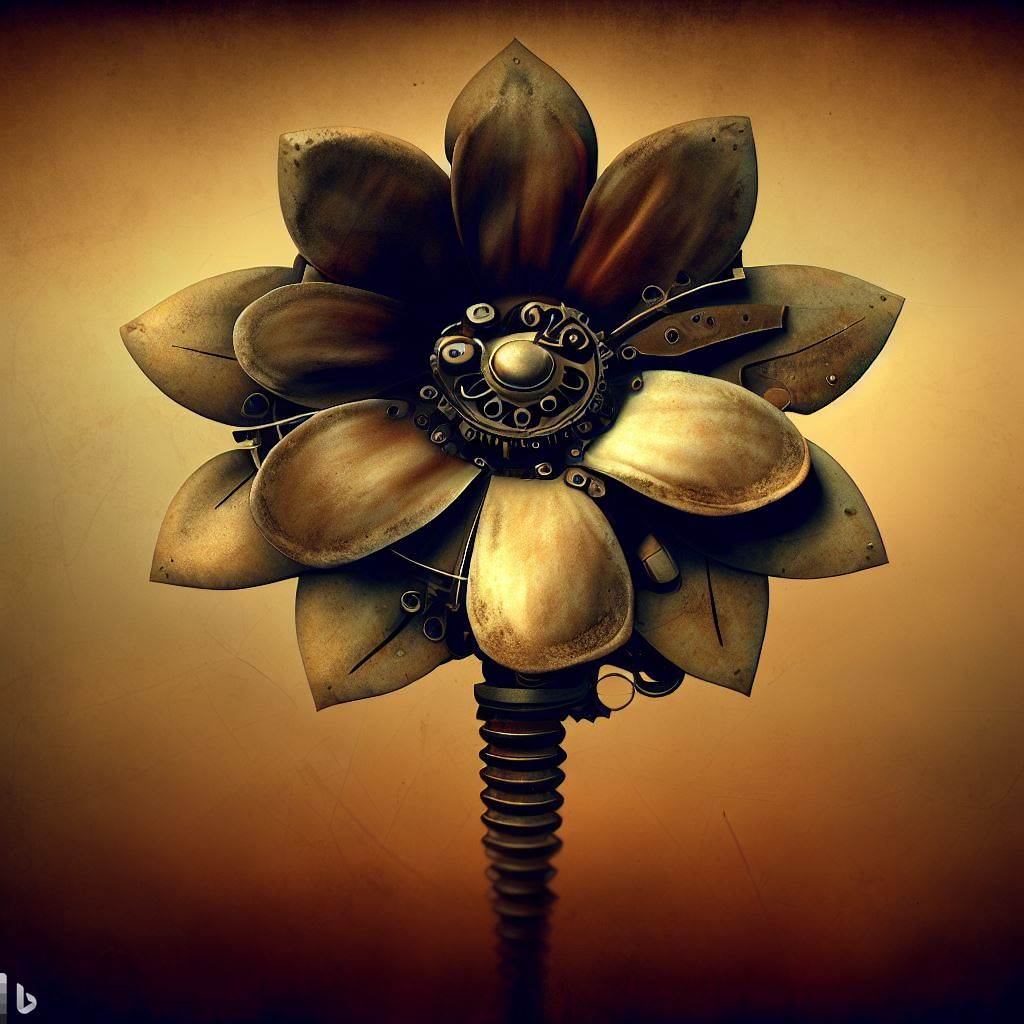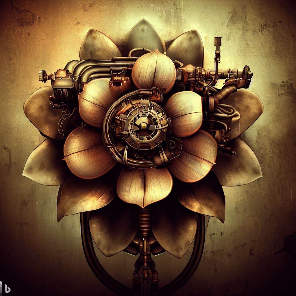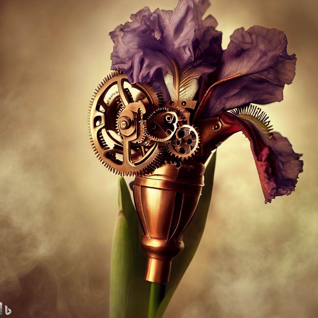 Pour cette série, j’ai fait imaginer au générateur d’images DALL.E : des fleurs mécaniques d’allure steampunk.