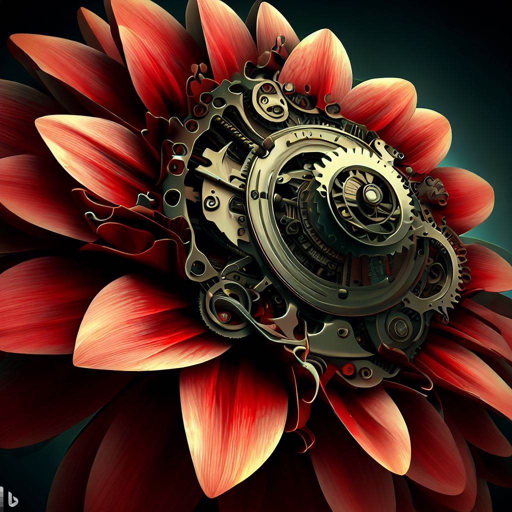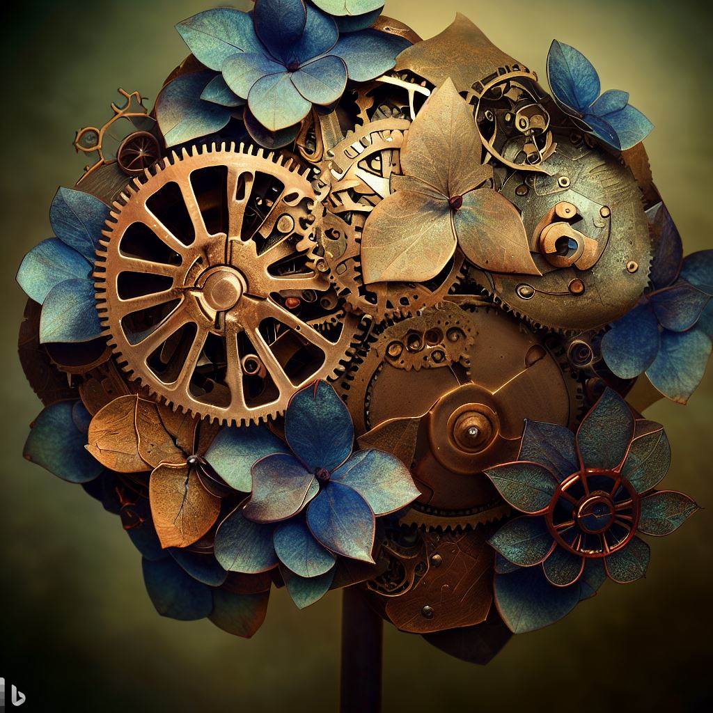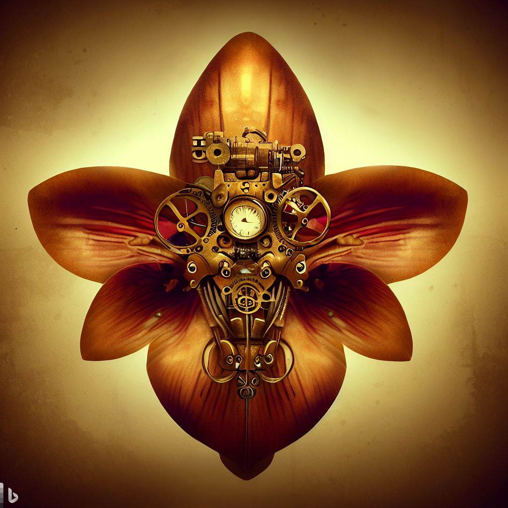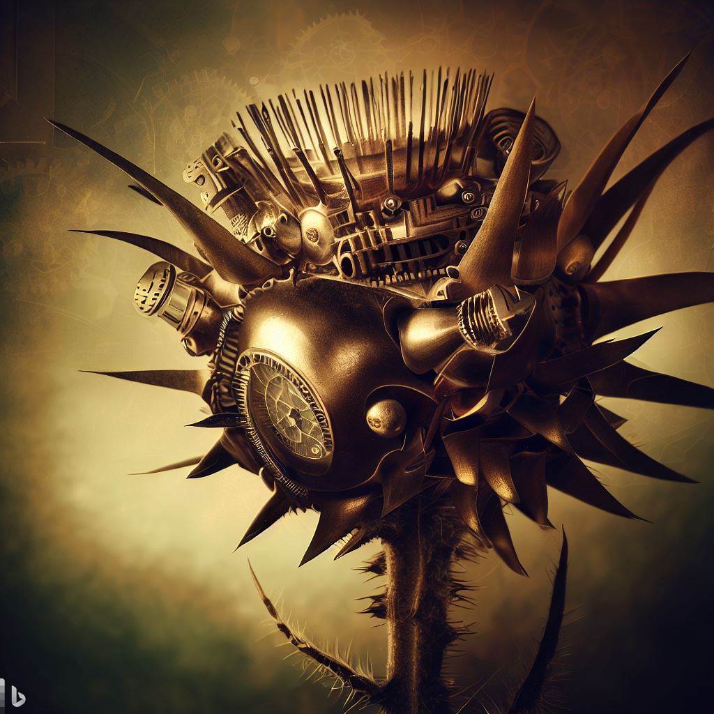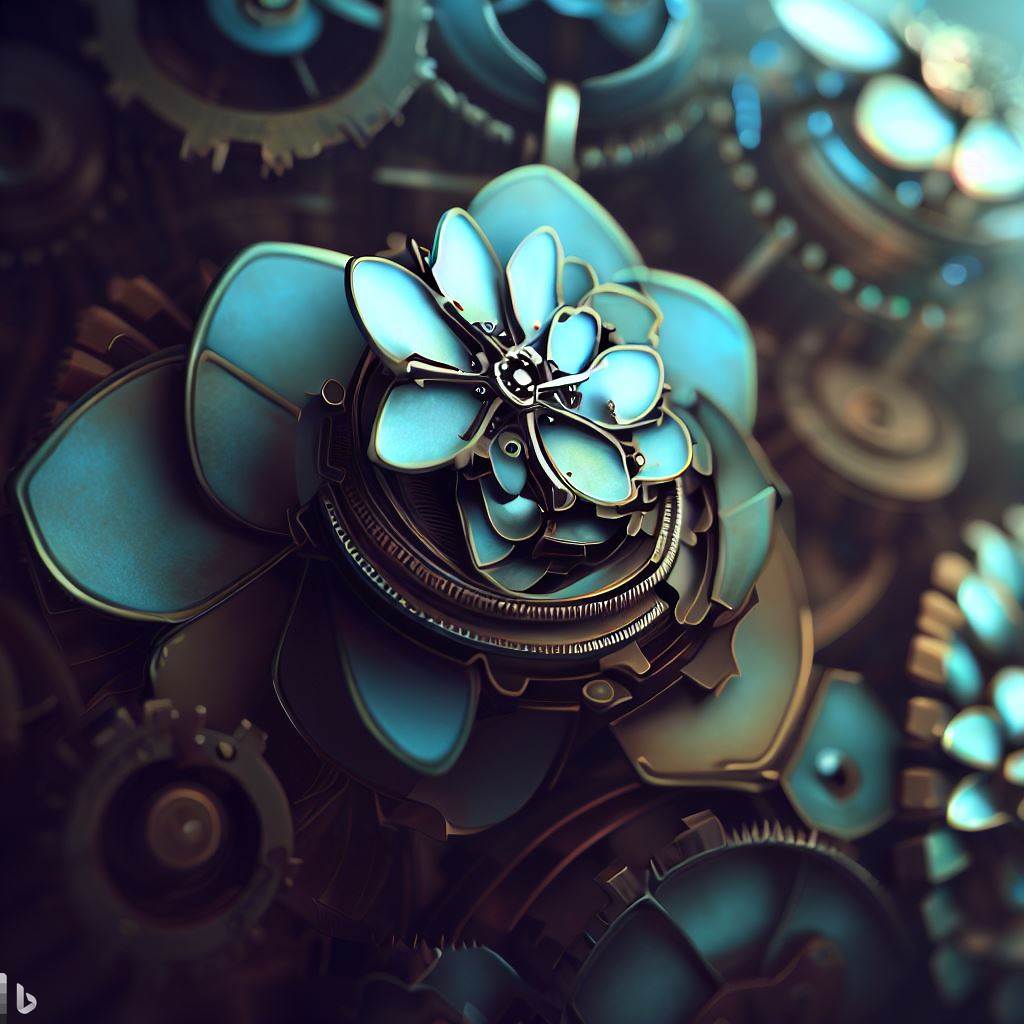Pour cette série, j’ai fait imaginer au générateur d’images DALL.E : des fleurs mécaniques d’allure steampunk.